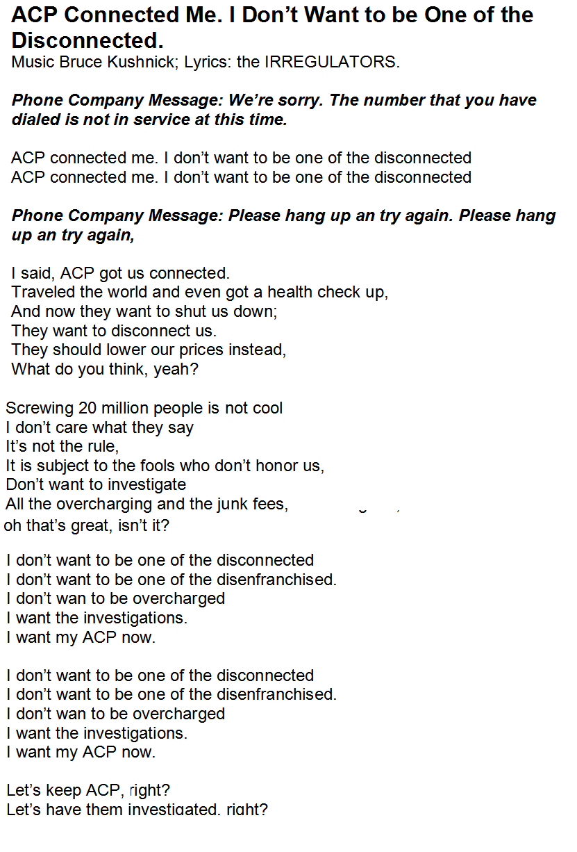 - Music by Bruce Kushnick, Lyrics by the IRREGULATORS.